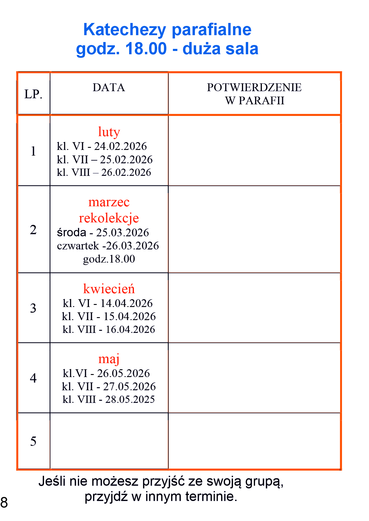 WAŻNE W przypadku, gdy nie można uczestniczyć wraz ze swoją grupą, zapraszamy na katechezę w drugim terminie.