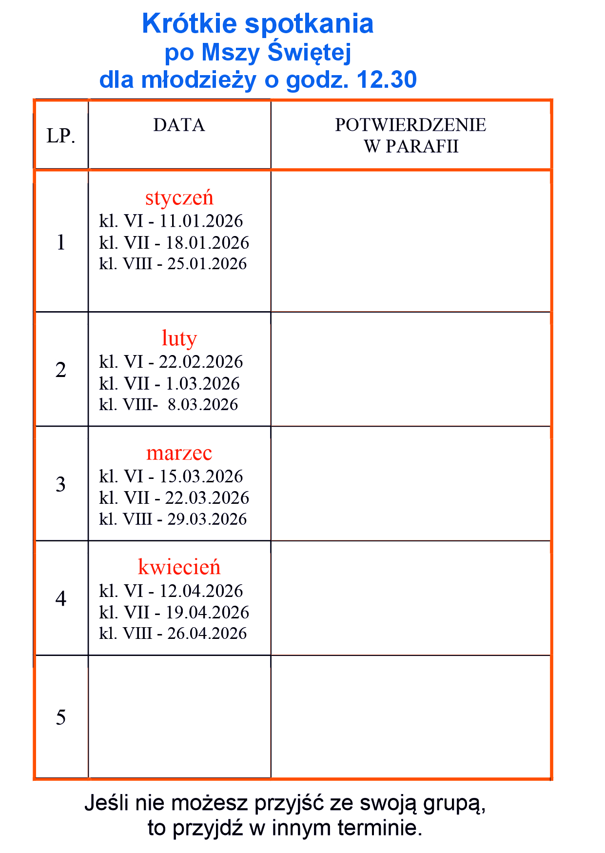 Każda grupa ma też raz w miesiącu krótkie spotkanie w sali parafialnej po Mszy Świętej dla młodzieży o 12.30 - wg wyznaczonych terminów.